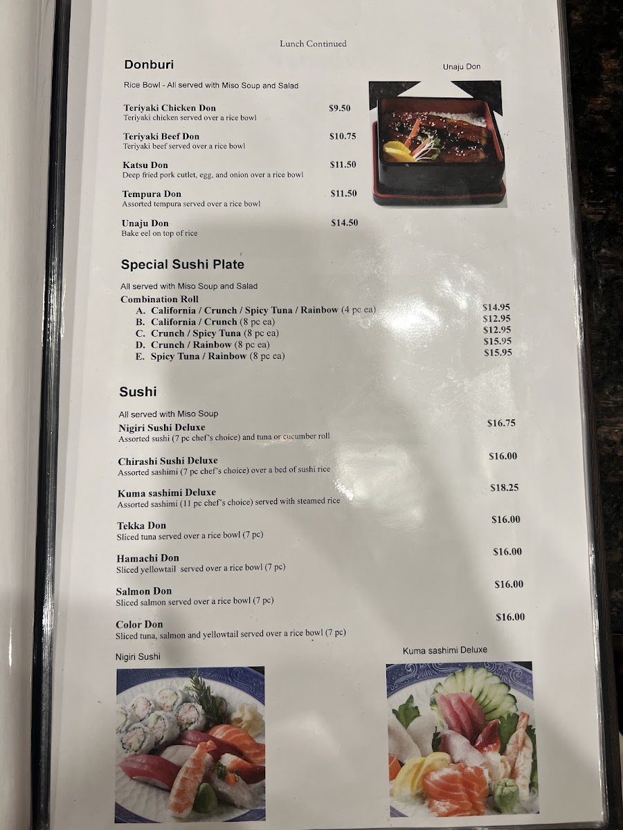 The menu at Kuma Sushi offers a delightful array of dishes crafted with the utmost care and fresh ingredients. For lunch, indulge in the Nigiri Sushi Lunch, which presents an exquisite selection of seven pieces of chef's choice sushi paired with either a delightful tuna or cucumber roll for just $21.75. If you prefer something light yet satisfying, the Chirashi Sushi Lunch boasts assorted sashimi beautifully arranged over a bed of perfectly seasoned sushi rice, making for a visually stunning and delicious meal at $20.75.